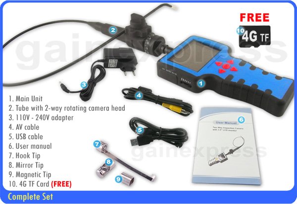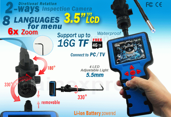 This Industrial type Video Inspection allows easy surveying on narrow and hard-to-reach places. It has a Snapshot, Real-Time Video recording, 2-directional rotations, bend probe tip from 0~180° (Right-top-left and vice versa) and whole probe rotation up to 330° making operation more easy. 8 Langauges are available for more convenient usage.