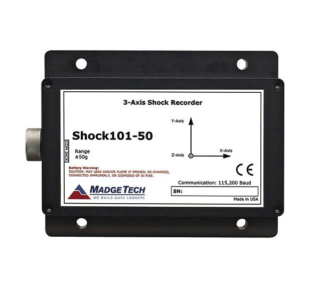 Data may be displayed for the three axes, or as calculated vector sums, providing overall acceleration and shock of the equipment or shipment being monitored. MadgeTech software provides a summary of statistics for average, minimum and maximum shock values. The device is available in four ranges ±5g, ±50g, ±100g and ±250g.