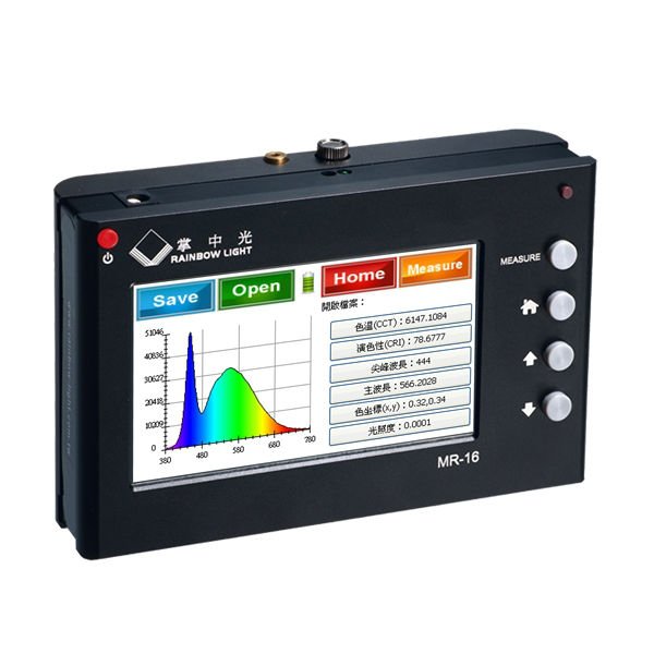 Portable Spectrometer with Display , the first CCD spectrometer in the world. Portable light and color meter free from connecting with computer. This light meter can capture and visible light source and to operate the device through touch panel instinctively, instant spectrum and data available. Several models available, such as PPF and LED BINS. Micro-spectrometer is the core of portable light meter. Its high stability and accuracy provide diversified application. Features First CCD spectrometer in the world, that free from connecting with computer 4.3 inch colorful touch screen Just aims at the light source, and click “measure” to test User-friendly Multi-functional interface Specification Resolution: 4.2 - 5 nm FWHM Wavelength Range: 380 – 780 nm Signal-to-noise Range: 0.3 % Spectral deviation: 0.12 % Integration Time: 1 ms – 24 s Input Fiber Connector: SMA905 Interface: USB Power: Rechargeable Li-ion Battery Screen: 4.3 inch touch / colorful screen Storage Media: Micro-SD Memory Card Dimensions: 148.5(W) x 96(D) x 34.5(H) mm Weight: 550 g Design / Made in Taiwan Model Specification \...