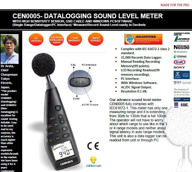 Our advance sound level meter CEN0005 fully complies with IEC61672-1. This meter has only one measuring range and it is extending from 30db to 130db that is full 100db. The operator will not have to worry about which range to use like in the 3 or 4 range models and neither about signal latency in auto range models. This unit is also a data logger can be readout from unit or through PC
