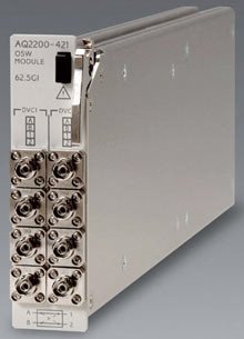 The AQ2200-421 OSW module features two optical switches with low insertion loss and superior switching reproducibility, in a one-slot size module, and allows selection of 1 x 2 or 2 x 2 port configuration according to the application.Moreover, the optical fiber type can also be selected between SMF (core diameter of 10 µm) and MMF (core diameter of 62.5 µm), allowing a wide range of measuring systems to be built corresponding to the systems or devices used in optical public networks or optical LANs.