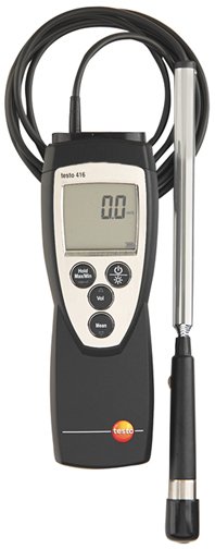 The compact TST0065 is an easy to use vane anemometer with attached 0.63 in. (16 mm) vane probe on a telescopic handle. Just enter the duct measurements directly into the testo TST0065 and volume flow measurements (cfm) are shown on the clear display. Timed and multi-point mean flow calculations allow easy flow analysis, volume accumulation estimates. and temperature variation monitoring. Min-Max values are one button simple, while the "Hold" function freezes the current readings in the display for easy data recording.