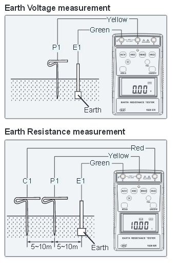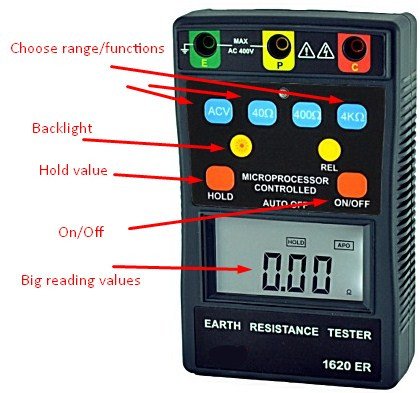 ● Microprocesser-controlled. ● Measures earth resistance in three ranges : 40Ω, 400Ω, 4kΩ. ● Capable of measuring earth voltage. ● ¾ digit (4000 counts). ● LCD backlight display. ● 2mA measuring current permits the testing of earth resistance without tripping earth leakage current breakers in the circuit. ● Data hold function. ● Relative function. ● Auto power-off function. ● Low battery indication. ● Calibration performed with supplied test leads.