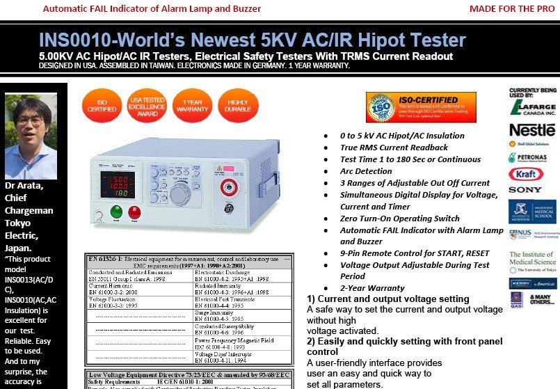 This Series Electrical Safety Testers offer an economic solution for the most frequently used electrical safety requirement, AC Withstanding test. This series provide a reliable and accurate test environment for the operator through a number of safety-oriented features, for instance zero turn-on switch, remote control function, and PASS/FAIL signal output.