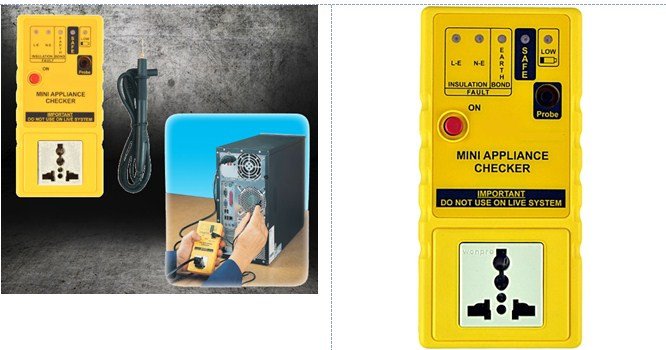 ● This a simplified Version of an appliance tester which use low voltage and low current to perform it's checks. ● Application Example The appliance is plugged into the mini appliance checker, then the probe make contact with the protective conductor. ● Other appliance checking Washing Machine Toaster Iron Dish Washer Stove