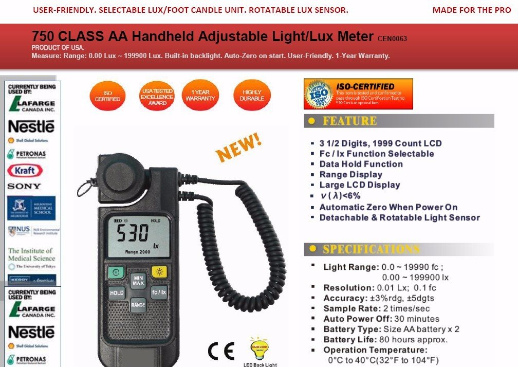 Featured item CEN0063-USA 750 CLASS AA HANDHELD LIGHT METER WITH FLEXIBLE ROTATABLE SENSOR