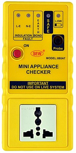 ● The 880 AT is a simplified Version of an appliance tester which use low voltage and low current to perform it's checks. ● Application Example The appliance is plugged into the mini appliance checker, then the probe make contact with the protective conductor. ● Other appliance checking Washing Machine Toaster Iron Dish Washer Stove