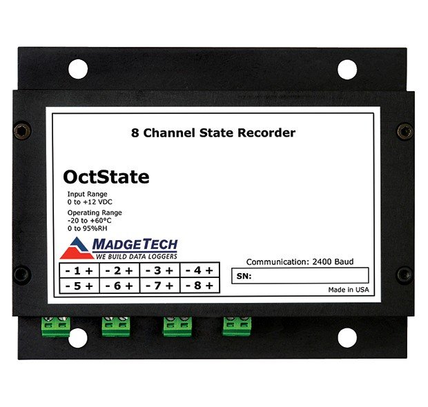 The OctState is an eight channel, battery powered, stand alone state change data logger. The device records time and date stamped, ON and OFF state changes for equipment run-time, usage and event duration data. It can be used with dry contact relay switches or analog voltage input signals to determine changes in status and open / closed contacts.